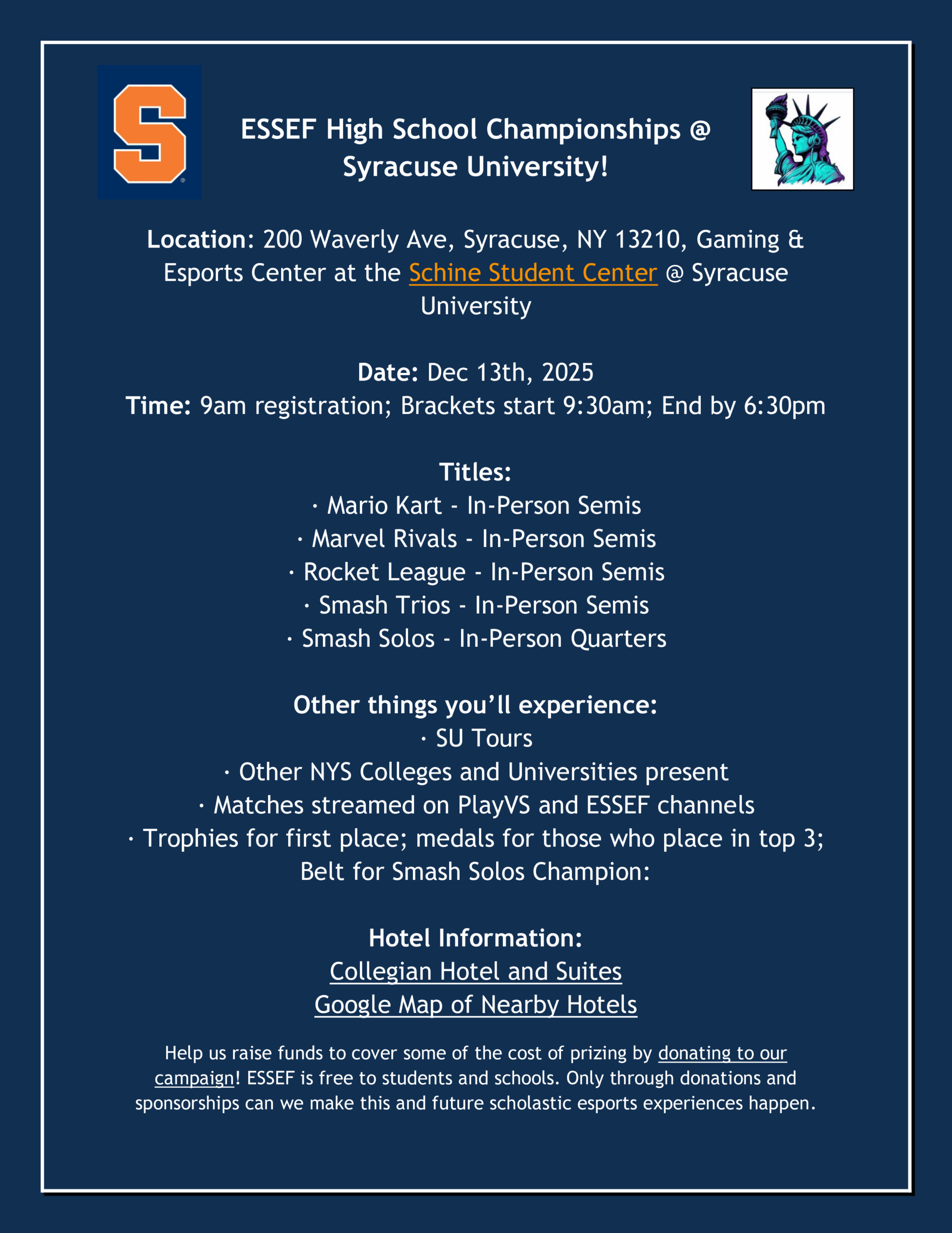 ESSEF is excited for the post-season and High School Championships at Syracuse University. If your team has a possibility to make it to the tournament, reserve your hotel in Syracuse by selecting the links below: